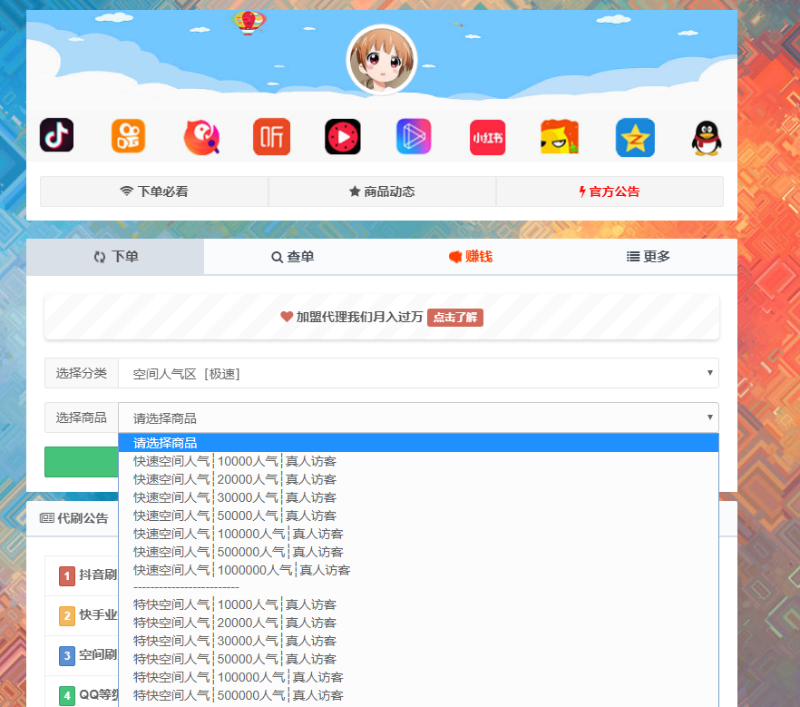首先进入本站平台,然后找到空间人气区。找到你需要刷的数量,1000访客起步。土豪可支刷100万!你是否心动了呢?那么就快点去下单吧。下单之后基本会给你秒刷,前提是你得选择特快的。其它的慢一些。越贵的就越快!超有超低价的,那个很慢的。反正价格不等哦!